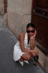 Lapel neckline Back opening detail Double-breasted closure with buttons. Pleated skirt
